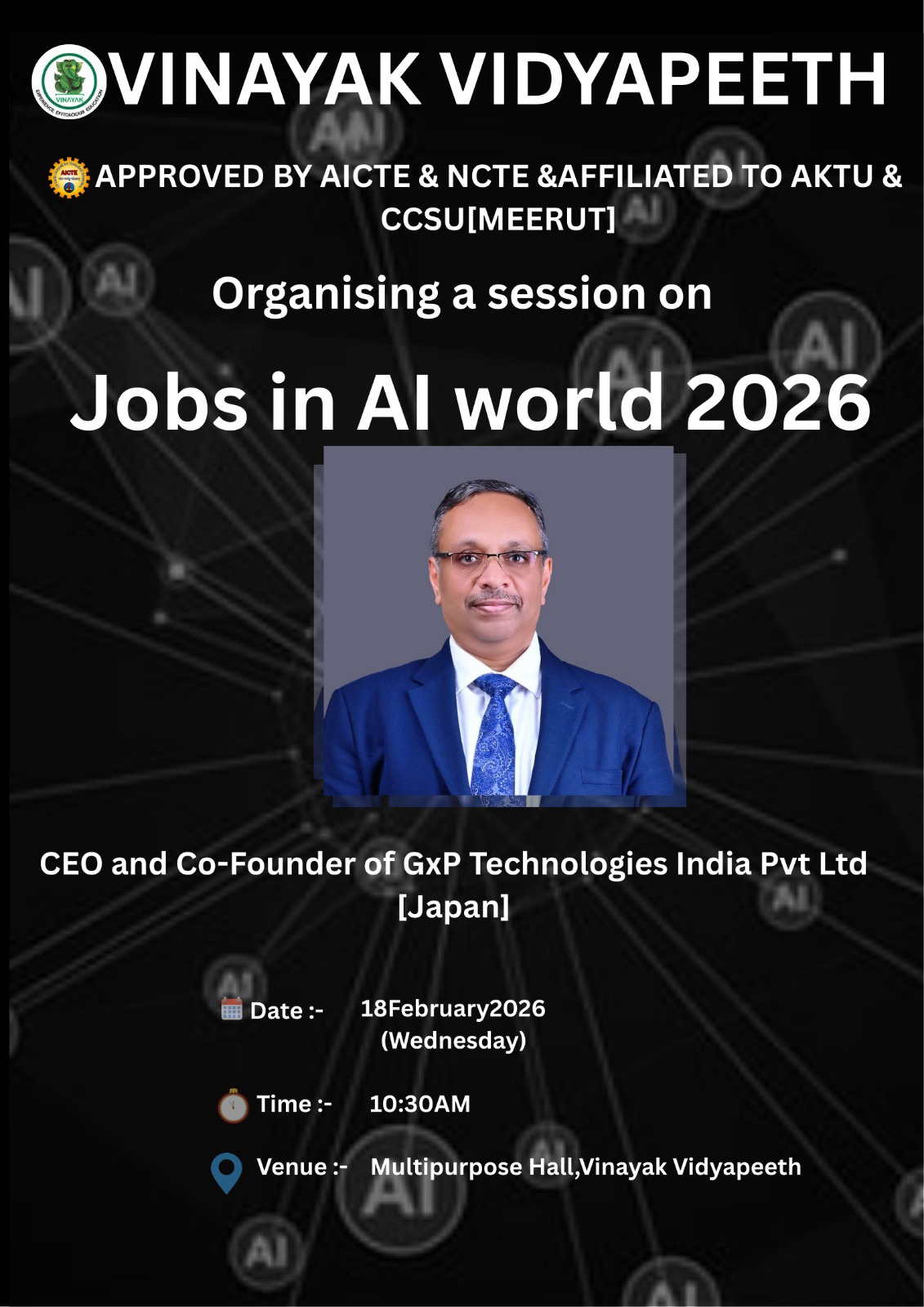 The session will be delivered by an esteemed industry expert, the CEO and Co-Founder of GxP Technologies India Pvt Ltd (Japan), who brings extensive international experience and deep expertise in AI-driven innovation and technological transformation.